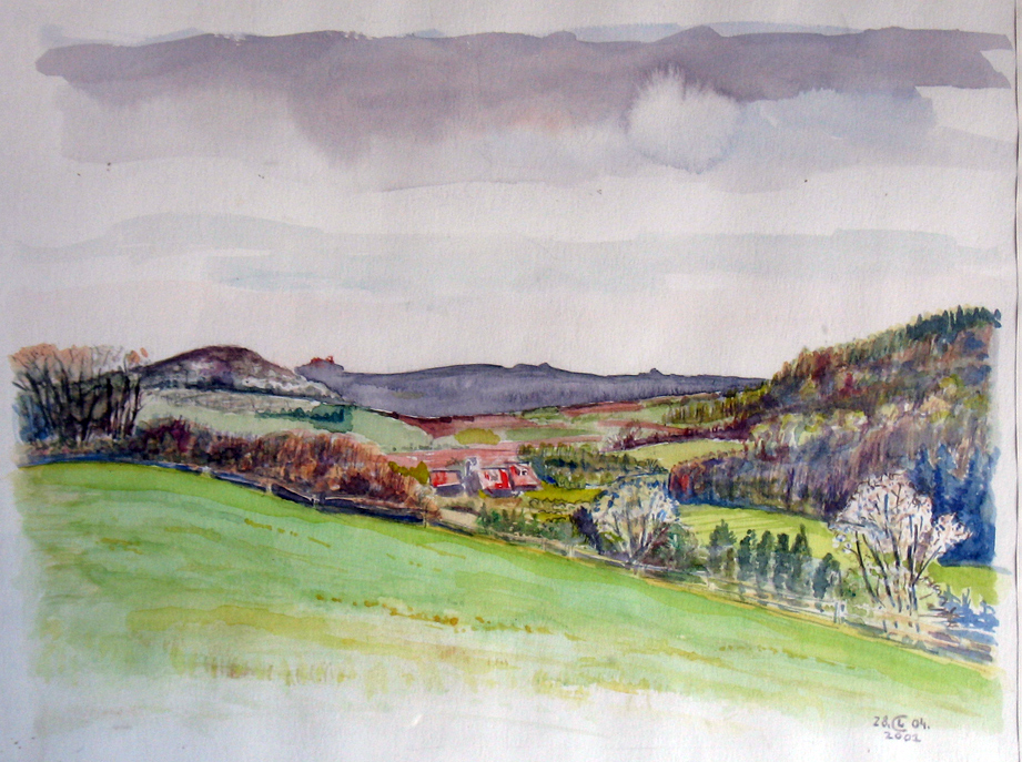 CL 28.04.2001 Rossdorf mit Blick auf den Ehrberg und den Otzberg (links)