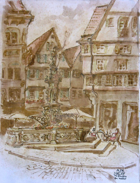 CL 13.06.2009 Neptun-Brunnen am Markt in Tübingen (Das Neckarwasser hat mitgemalt: das Blatt ist mir in den Neckar gefallen)